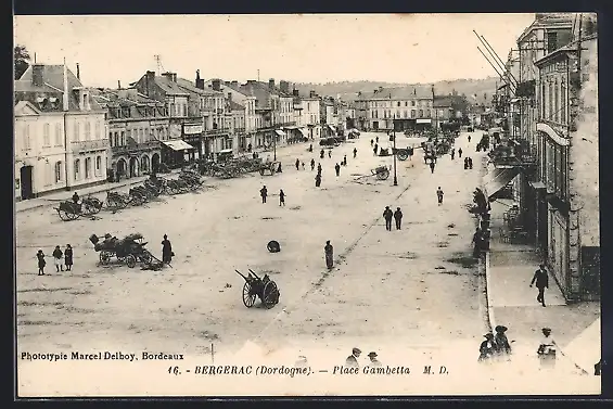 AK Bergerac, Place Gambetta animée avec passants et charrettes