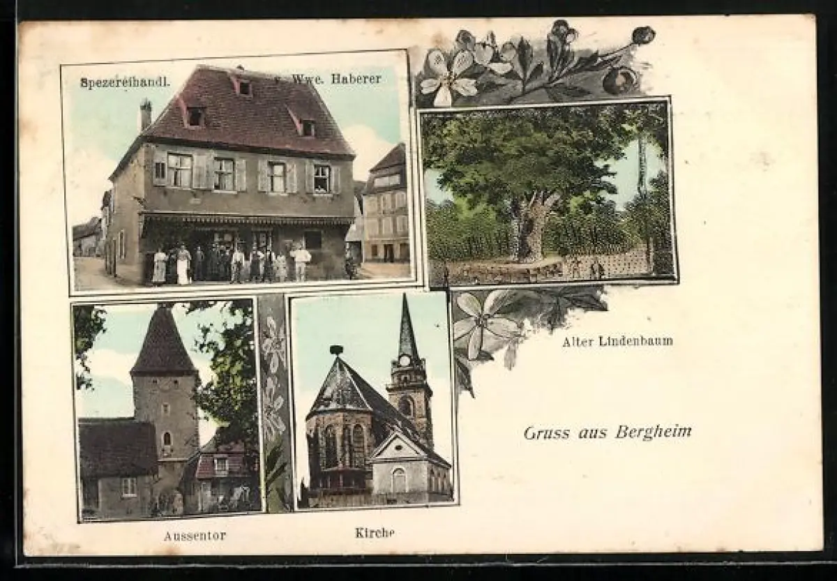 AK Bergheim, Gasthof von Wwe. Haberer, Alter Lindenbaum, Aussentor, Kirche