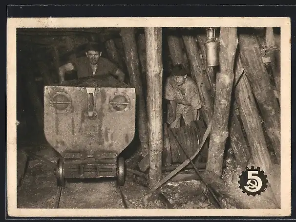 AK Bergleute mit Lore in einem Kohle-Bergwerk