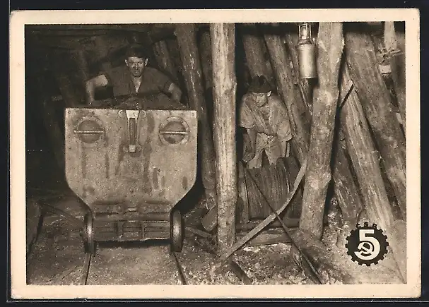 AK Bergleute mit Lore in einem Kohle-Bergwerk