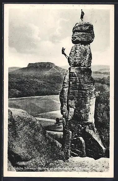 AK Bergsteiger beim Abseilen von der Barbarine-Pfaffenstein in der Sächs. Schweiz