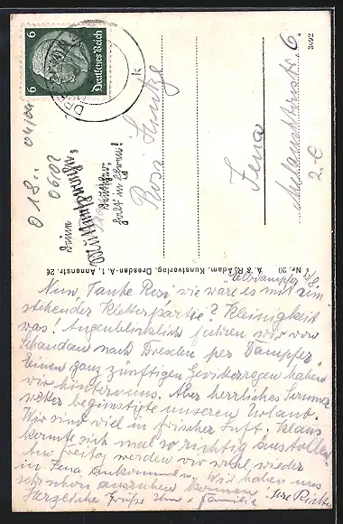 Personenbezogene Daten auf der Rückseite der Karte wurden durch blauen Textmarker unkenntlich gemacht. Die blauen Stellen sind auf die Vorderseite durchgeweicht und wirken sich negativ auf das Postkartenfoto aus