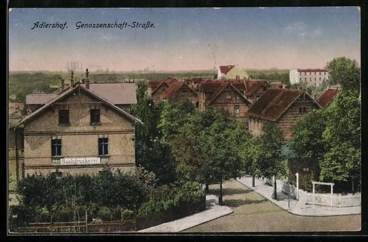 AK Berlin-Adlershof, Genossenschaft-Strasse mit Buchdruckerei