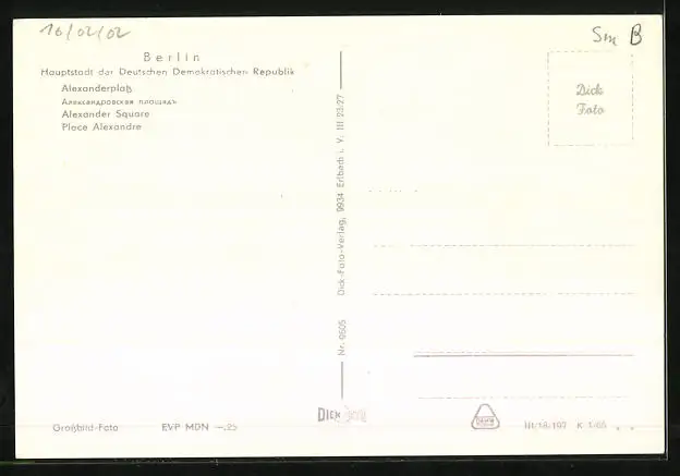 Personenbezogene Daten auf der Rückseite der Karte wurden durch blauen Textmarker unkenntlich gemacht. Die blauen Stellen sind auf die Vorderseite durchgeweicht und wirken sich negativ auf das Postkartenfoto aus
