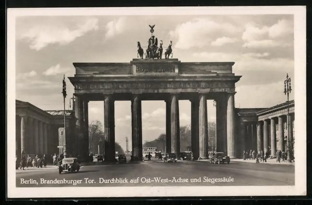 AK Berlin, Autodurchfahrt durchs Brandenburger Tor, Blick auf Ost-West-Achse und Siegessäule