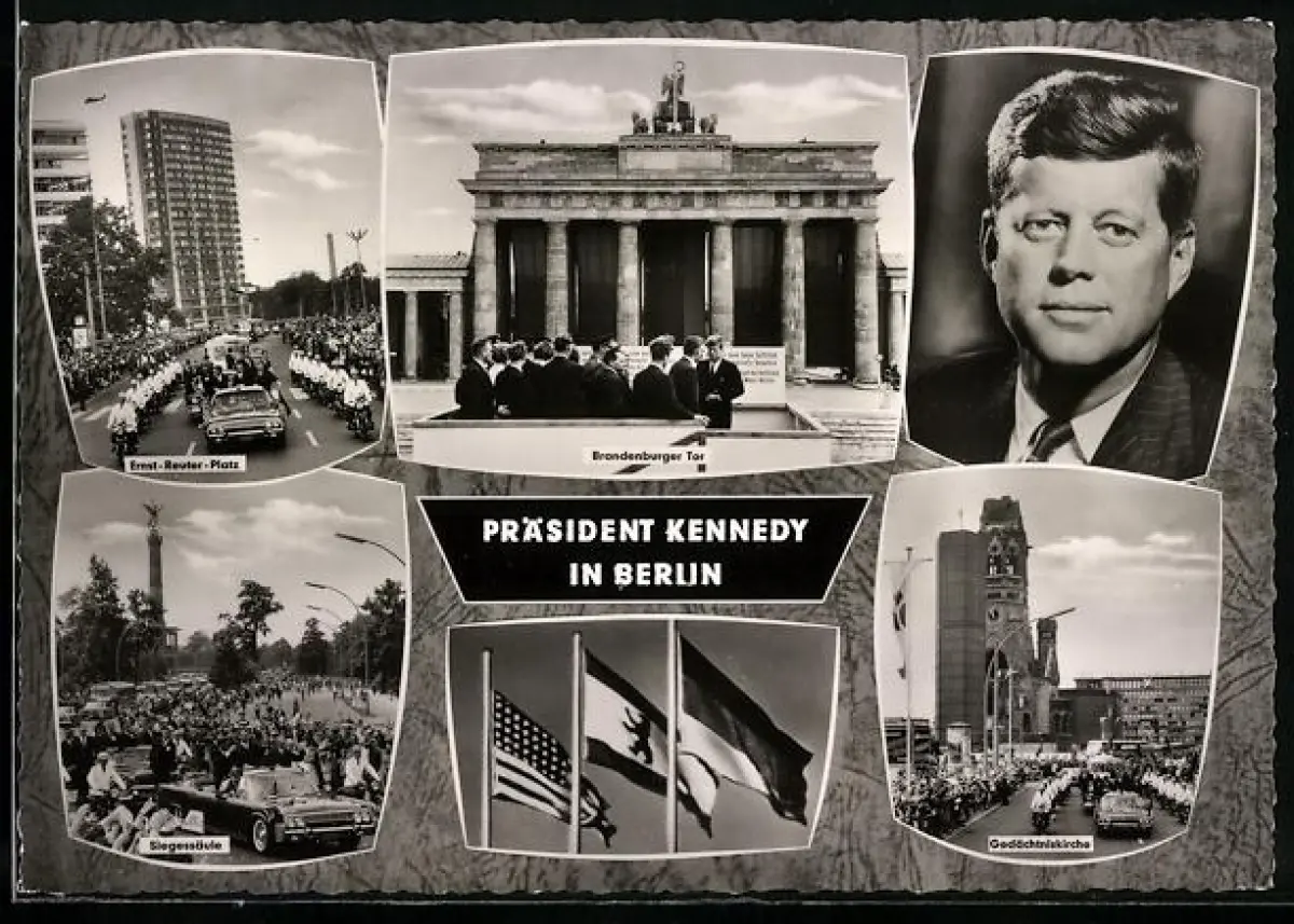 AK Berlin, Besuch von J. F. Kennedy, Präsident der USA, am Brandenburger Tor, Gedächtniskirche u. Siegessäule