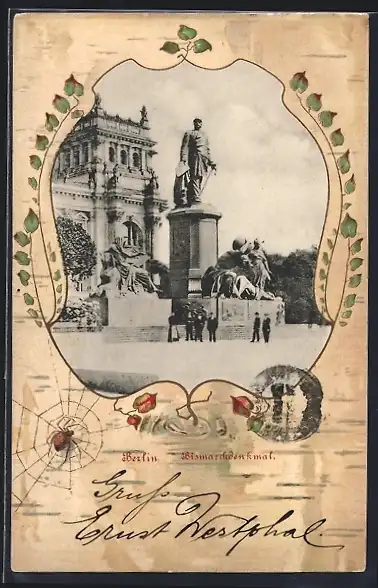 AK Berlin, Blick auf das Bismarckdenkmal, Passepartout mit Spinne