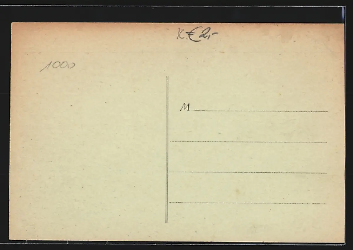 Personenbezogene Daten auf der Rückseite der Karte wurden durch blauen Textmarker unkenntlich gemacht. Die blauen Stellen sind auf die Vorderseite durchgeweicht und wirken sich negativ auf das Postkartenfoto aus