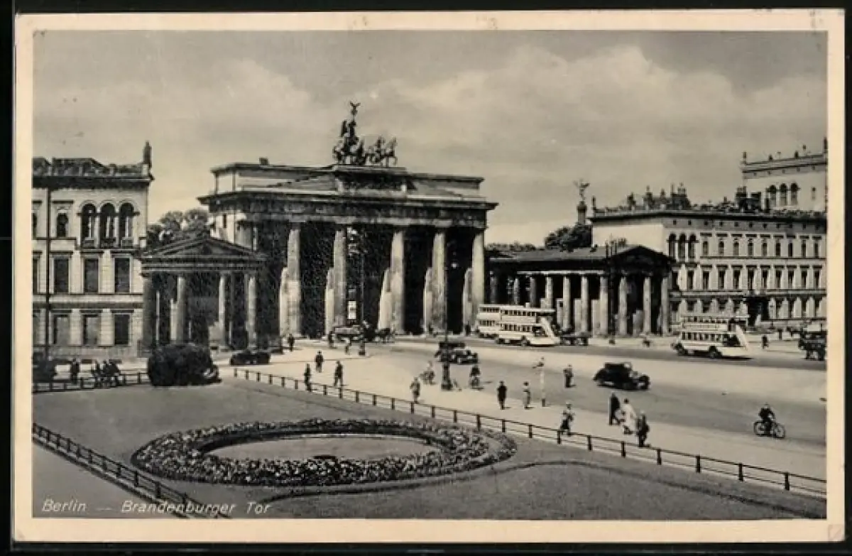 AK Berlin, Brandenburger Tor mit Bussen und Passanten
