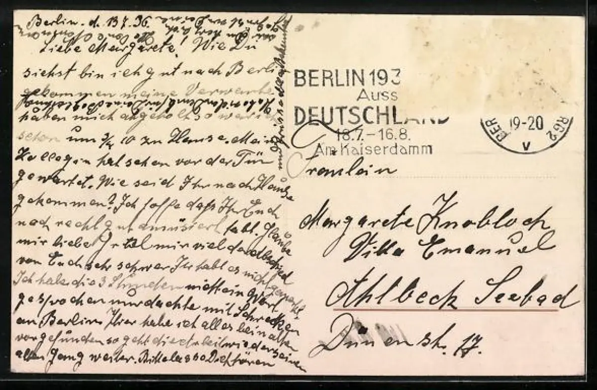 Personenbezogene Daten auf der Rückseite der Karte wurden durch blauen Textmarker unkenntlich gemacht. Die blauen Stellen sind auf die Vorderseite durchgeweicht und wirken sich negativ auf das Postkartenfoto aus