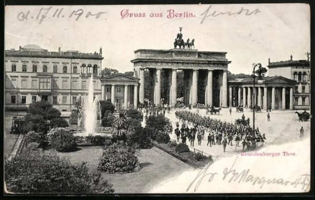 AK Berlin, Brandenburger Tor mit Soldatenaufmarsch