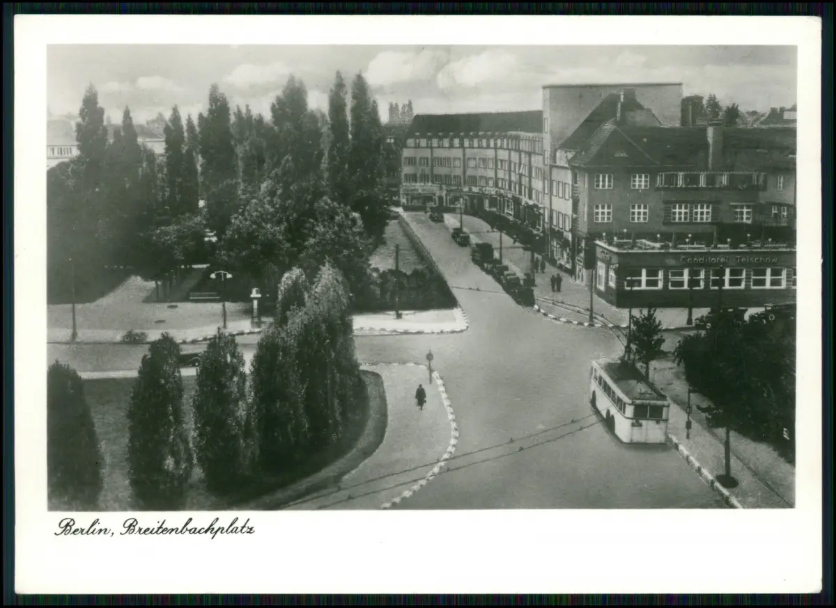 Berlin Breitenbachplatz – eindrucksvolle Stadtansicht mit Straßenbahn und der Café-Konditorei Telschow, aufgenommen in den 1930er-Jahren. Zeigt die urbane Architektur der Charlottenburger Straßen und die typische Verkehrsszene jener Zeit.