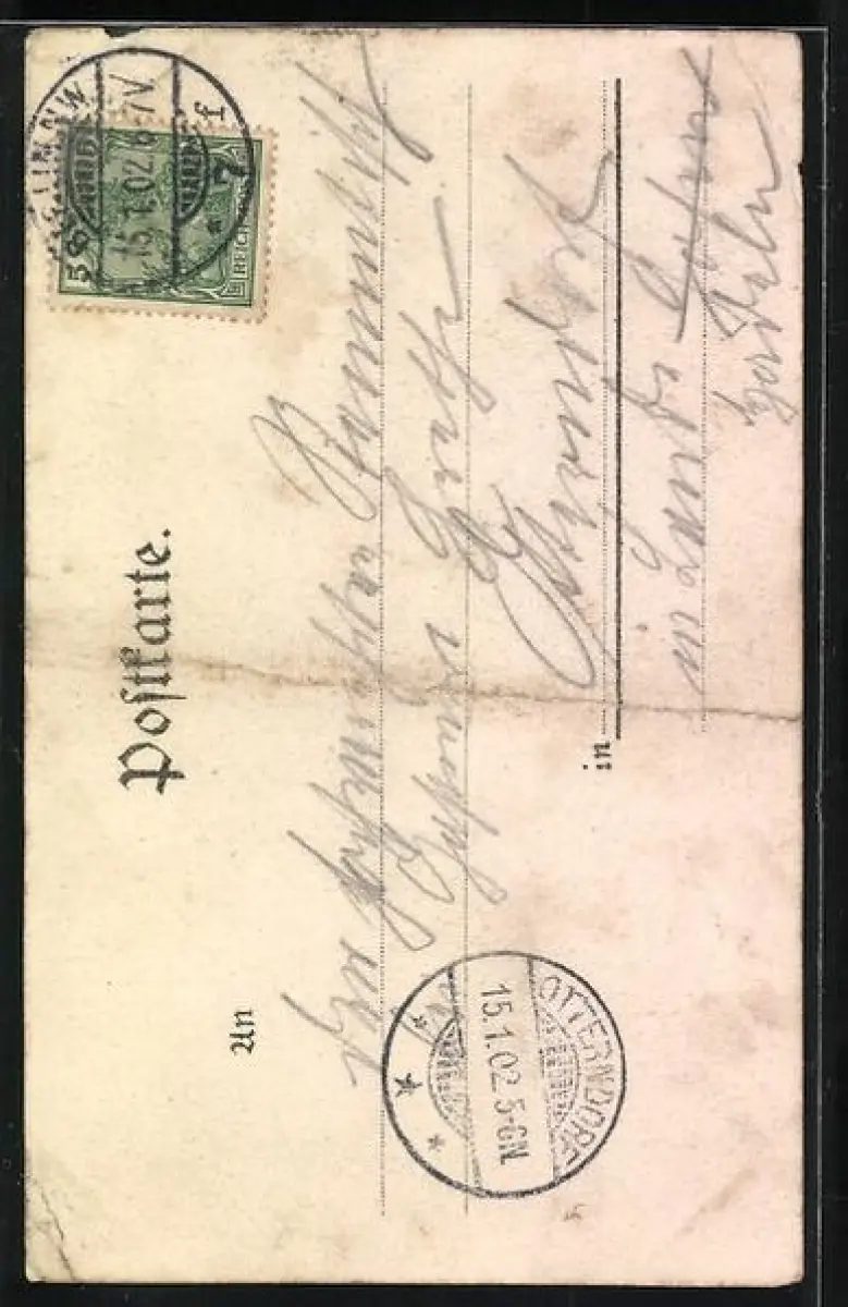 alte Ansichtskarte, gelaufen 1902, Eckknicke rechts, Bugspur mittig, kl. Kantenschaden re. oben