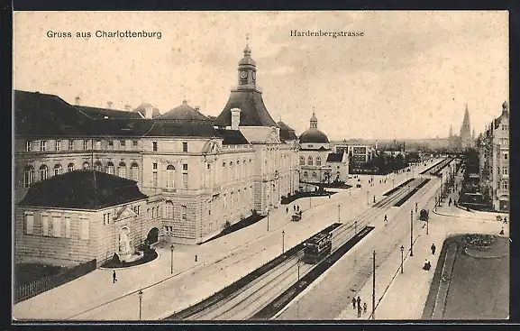 AK Berlin-Charlottenburg, Hardenbergstrasse mit Strassenbahn, Kaiser Wilhelm Gedächniskirche