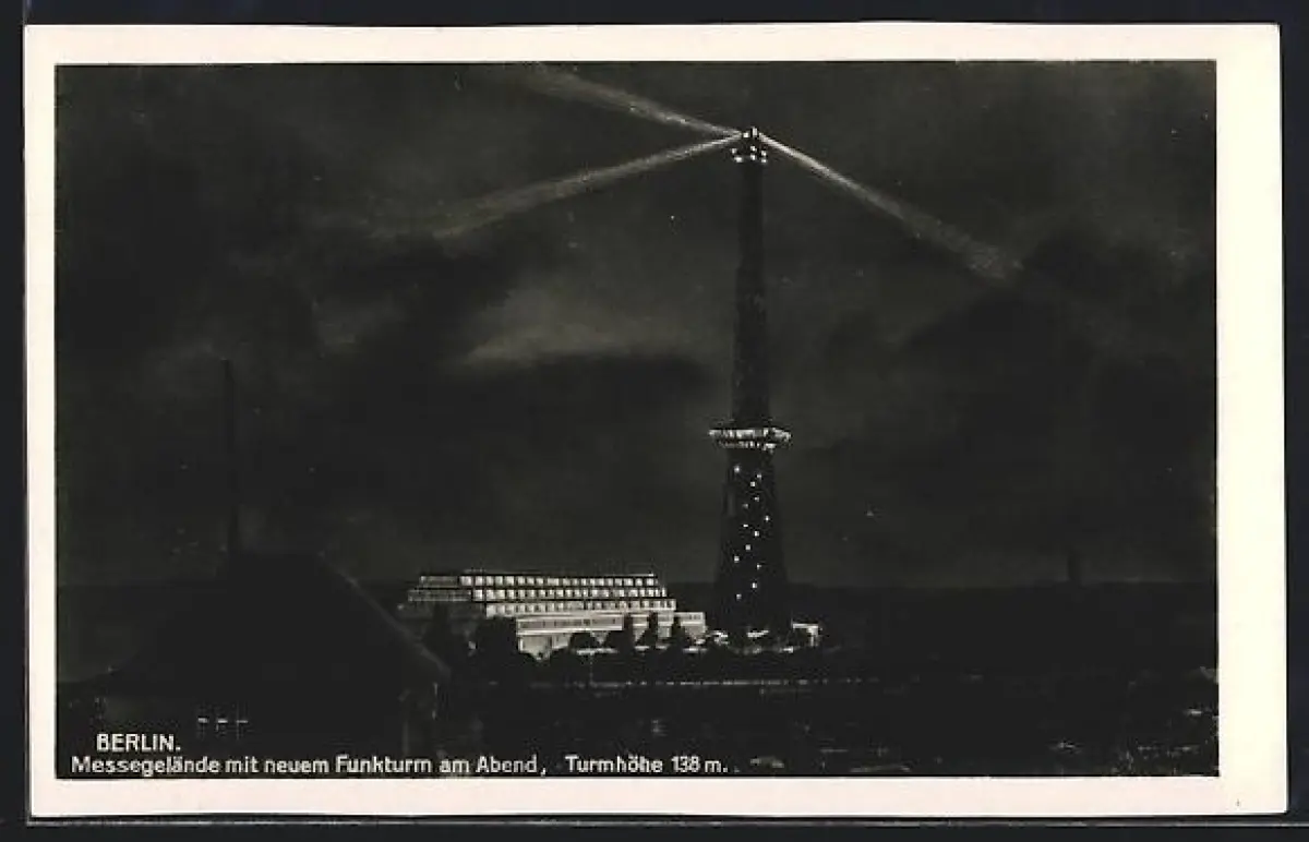 AK Berlin-Charlottenburg, Messegelände mit neuem Funkturm am Abend