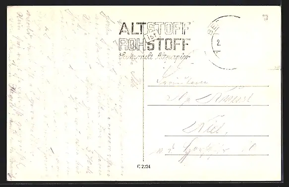 Personenbezogene Daten auf der Rückseite der Karte wurden durch blauen Textmarker unkenntlich gemacht. Die blauen Stellen sind auf die Vorderseite durchgeweicht und wirken sich negativ auf das Postkartenfoto aus