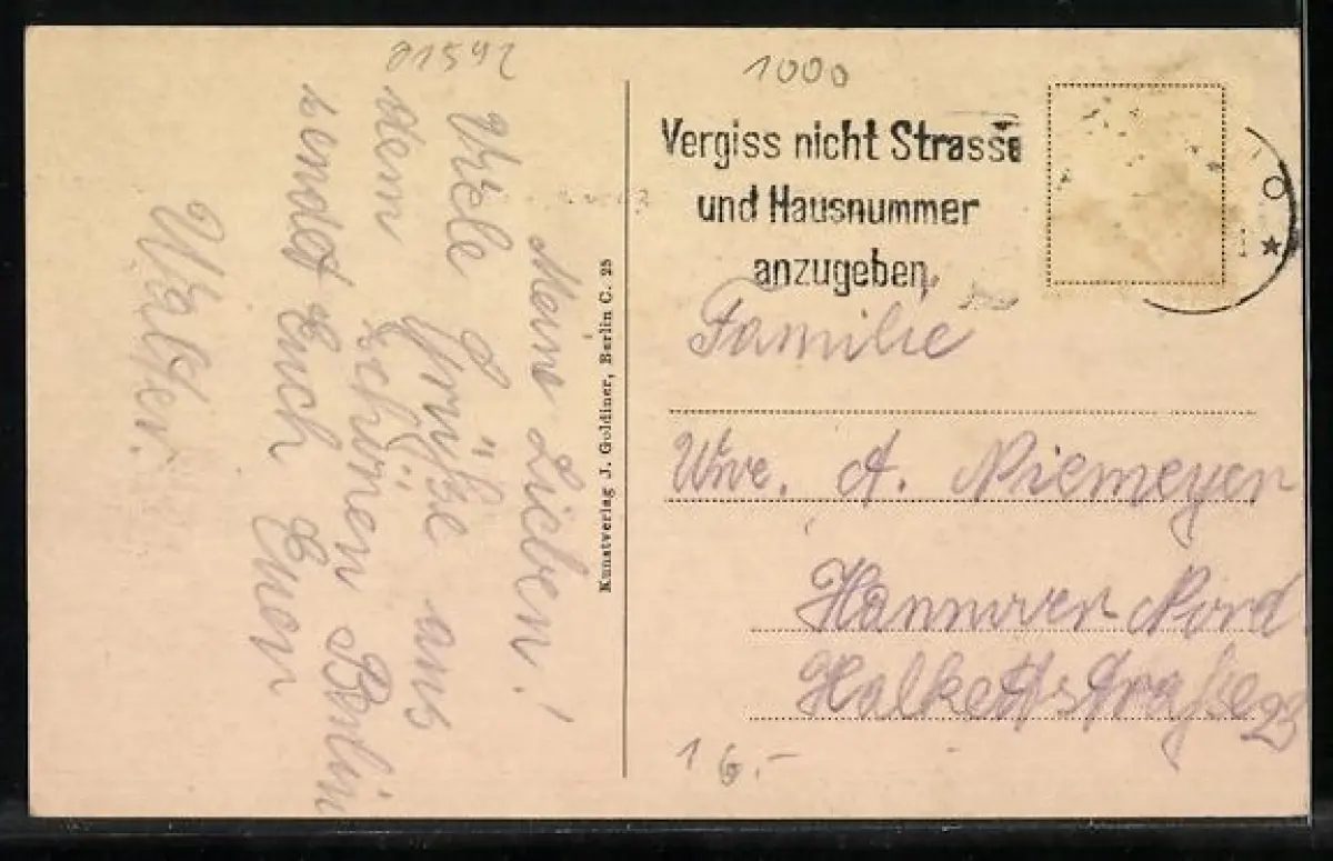 Personenbezogene Daten auf der Rückseite der Karte wurden durch blauen Textmarker unkenntlich gemacht. Die blauen Stellen sind auf die Vorderseite durchgeweicht und wirken sich negativ auf das Postkartenfoto aus