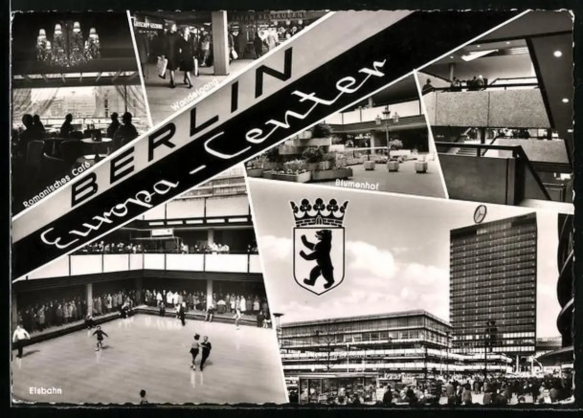 AK Berlin, Europa-Center mit Romanischem Café, Wandelgang, Eisbahn, Blumenhof
