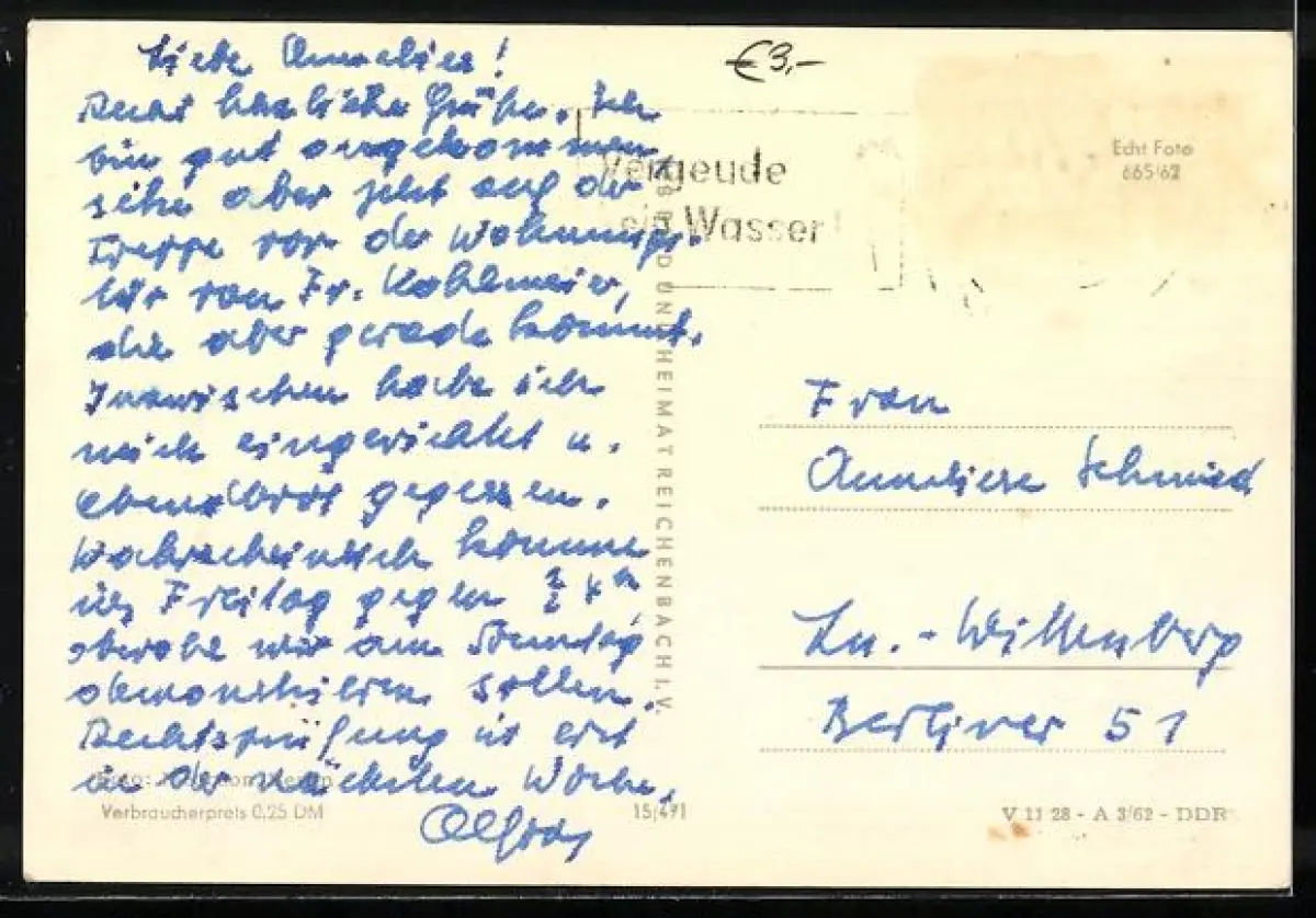 Personenbezogene Daten auf der Rückseite der Karte wurden durch blauen Textmarker unkenntlich gemacht. Die blauen Stellen sind auf die Vorderseite durchgeweicht und wirken sich negativ auf das Postkartenfoto aus
