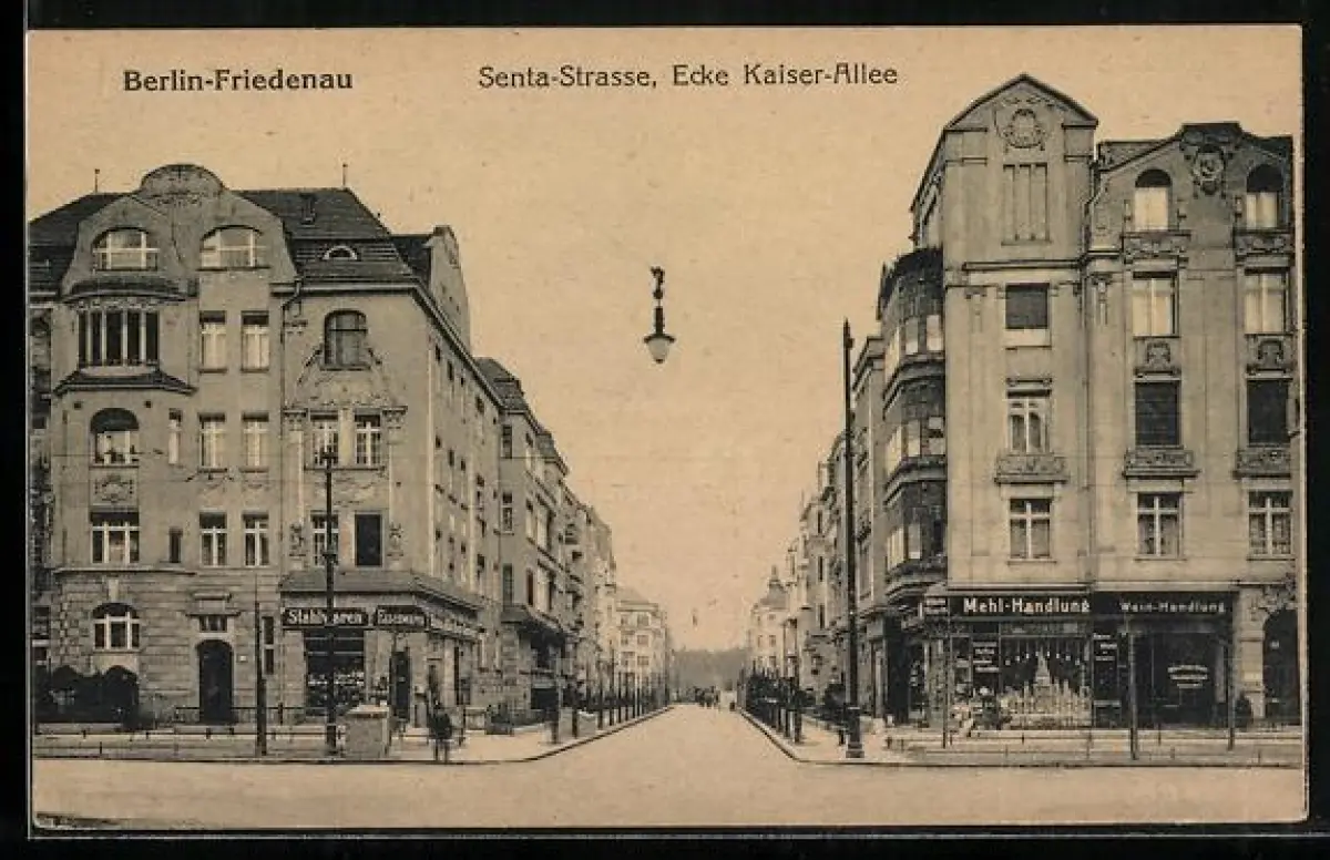 AK Berlin-Friedenau, Sentastrasse Ecke Kaiser-Allee, Stahlwaren, Mehl-Handlung