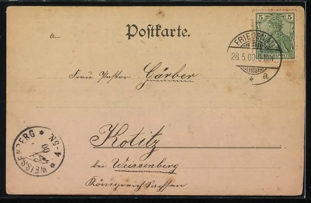 alte Ansichtskarte, gelaufen 1900, Abriebspuren Ecken re., Klebe- und Papierreste li. unten, Stempelspur, guter Zustand