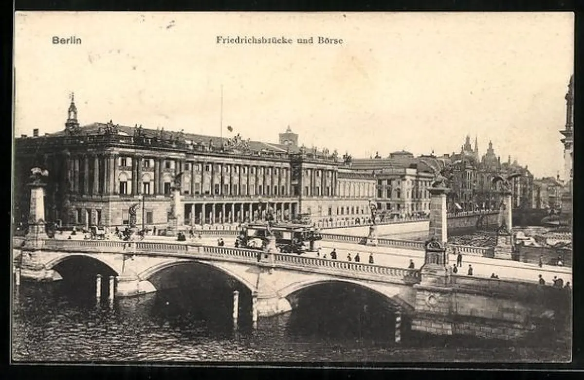 AK Berlin, Friedrichsbrücke mit Strassenbahn und Börse