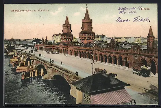 AK Berlin-Friedrichshain, Oberbaumbrücke und Hochbahn aus der Vogelschau