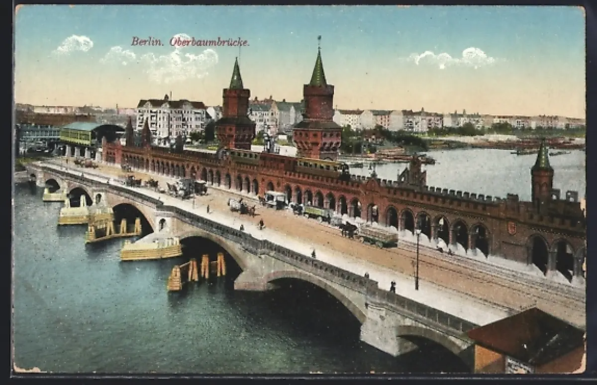 AK Berlin-Friedrichshain, Stadtbahn und Verkehr auf der Oberbaumbrücke