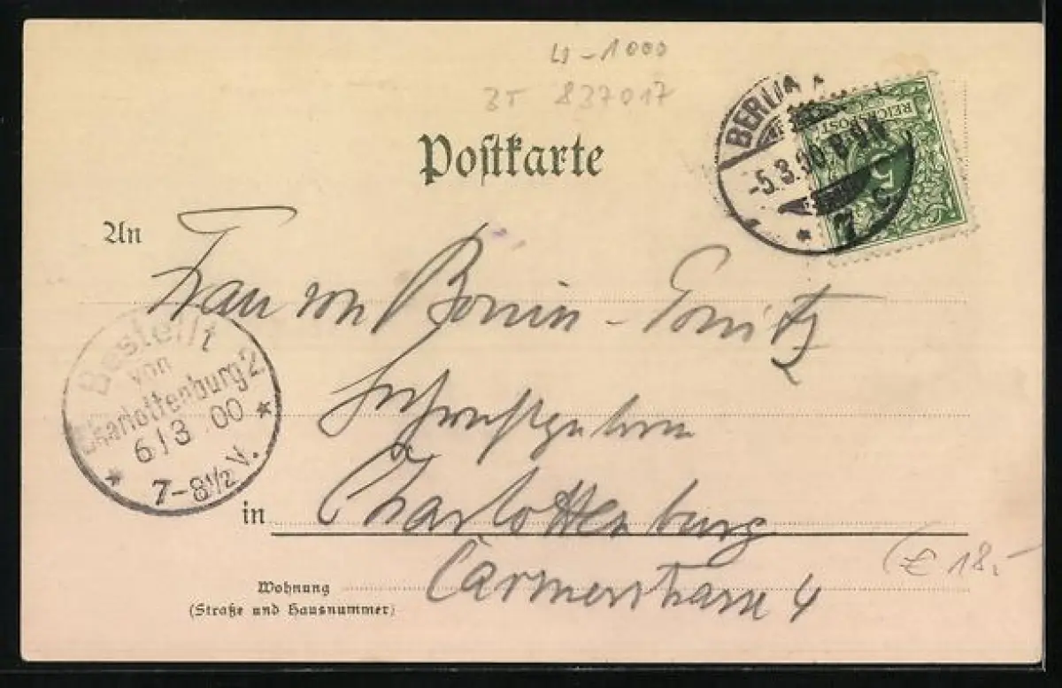 alte Ansichtskarte, gelaufen 1900, vorderseitig Klebe- und Papierreste, guter Zustand