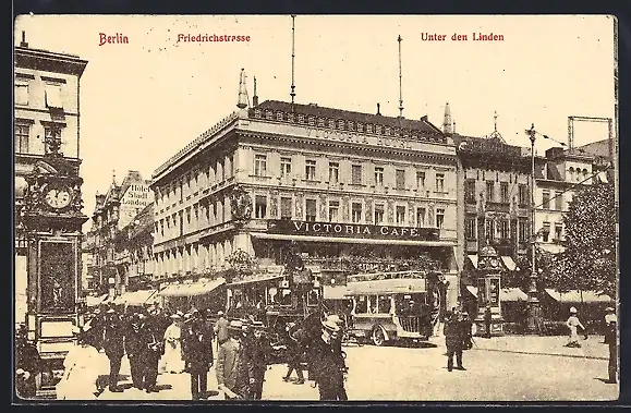 AK Berlin, Friedrichstrasse Ecke Unter den Linden mit Viktoria Cafe und Hotel Stadt London, Strassenbahn