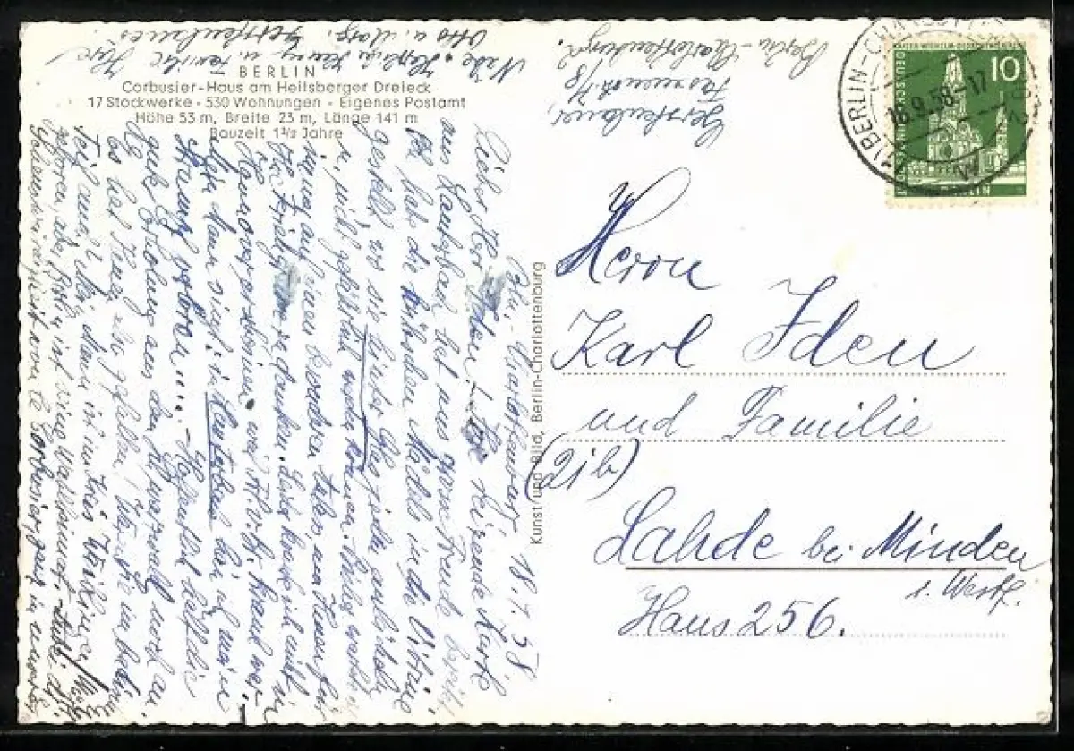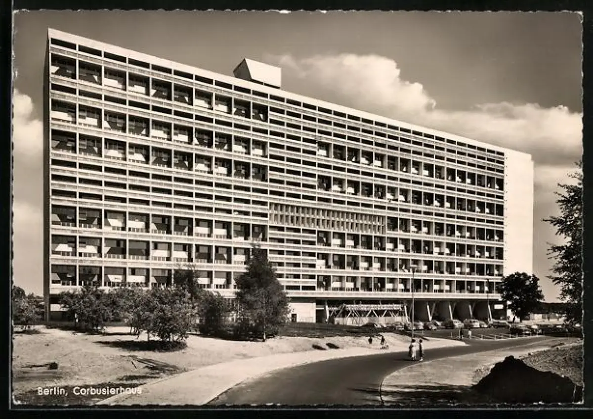 AK Berlin, Frontalansicht des Corbusierhauses mit Passanten