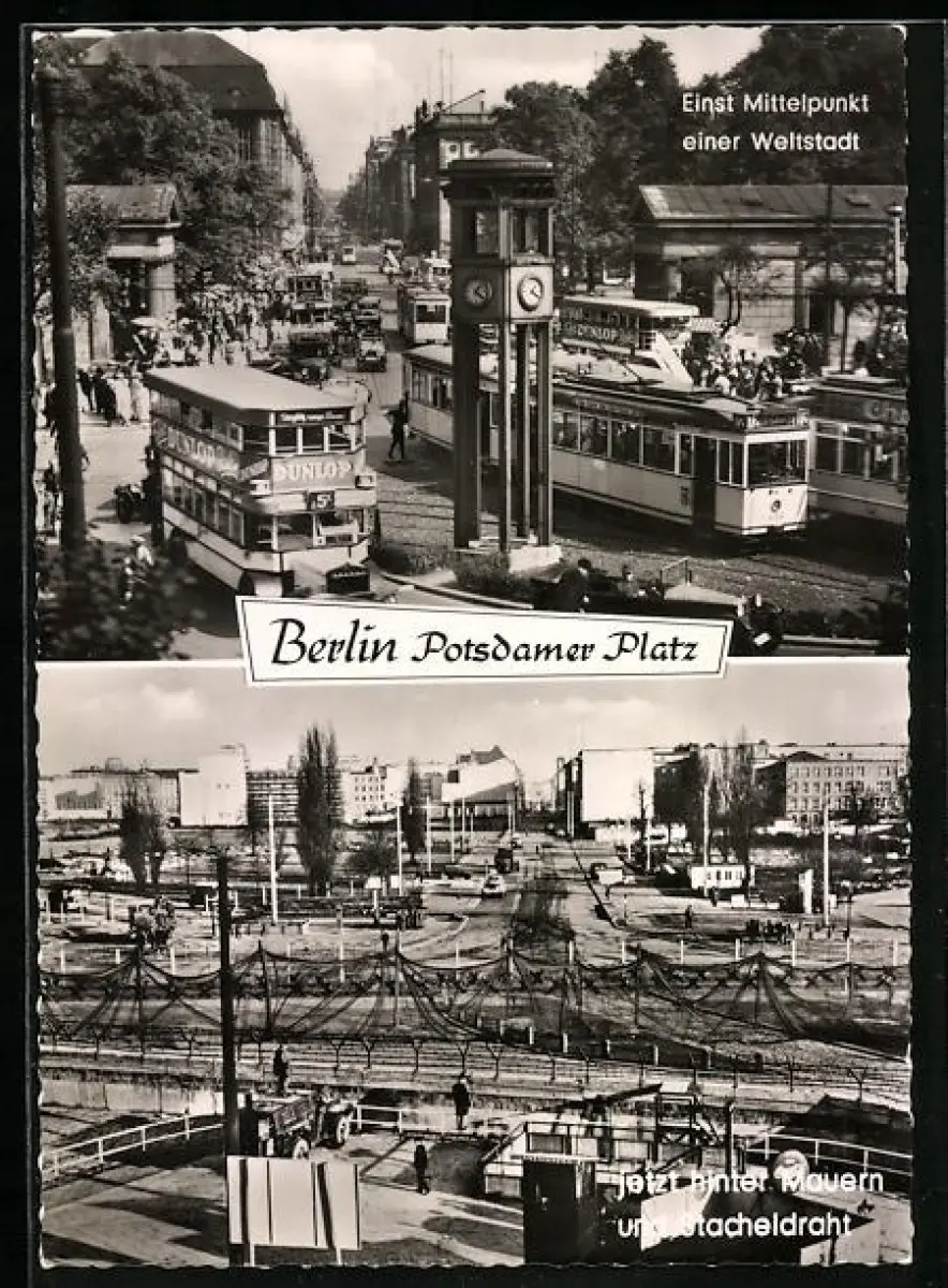 AK Berlin, Grenze am Potsdamer Platz, Strassenbahn, Stacheldraht