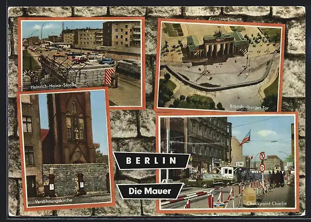 AK Berlin, Grenzübergang Checkpoint Charlie, Mauer in der Heinrich-Heine Strasse und am Brandenburger Tor