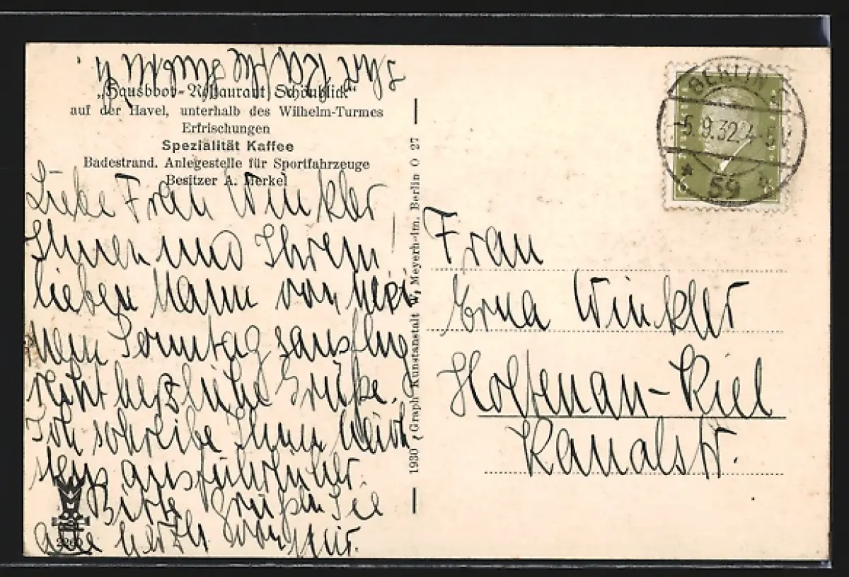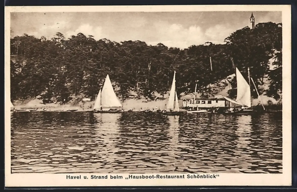 AK Berlin-Grunewald, Hausboot-Restaurant Schönblick, Bes. A. Merkel, Strand an der Havel