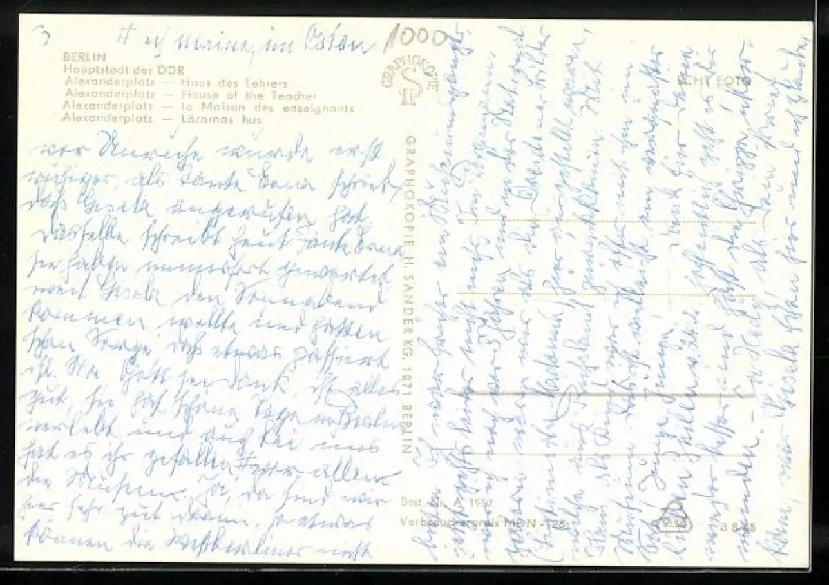 Personenbezogene Daten auf der Rückseite der Karte wurden durch blauen Textmarker unkenntlich gemacht. Die blauen Stellen sind auf die Vorderseite durchgeweicht und wirken sich negativ auf das Postkartenfoto aus