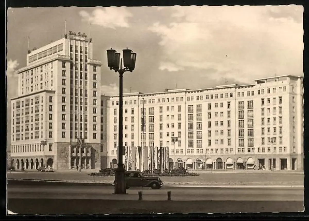 AK Berlin, Haus in der Stalinallee mit Strassenpartie