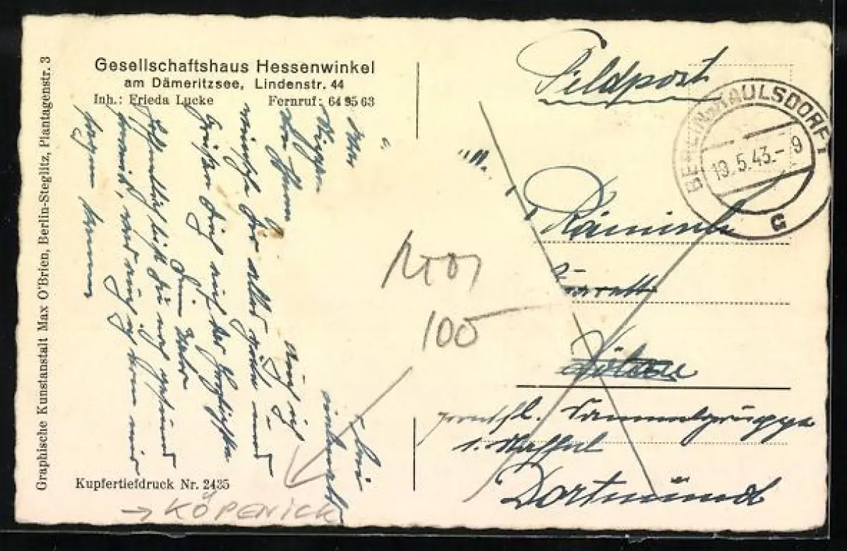 AK Berlin-Hessenwinkel, Gasthof Gesellschaftshaus Hessenwinkel, Terrasse am Dämeritzsee, Lindenstrasse 44