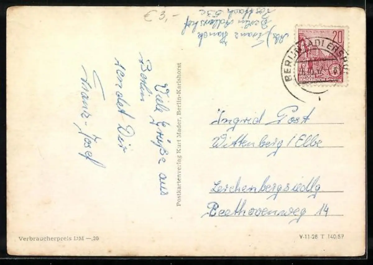 gelaufen 1957, Eckknicke li. oben, re. oben und re. unten, guter Zustand