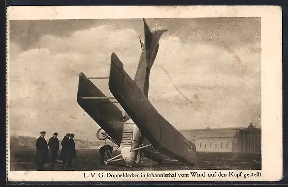 AK Berlin-Johannisthal, LVG Doppeldecker-Flugzeug vom Wind auf den Kopf gestellt