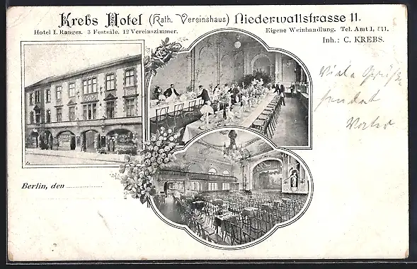 AK Berlin, Kath. Vereinshaus Krebs Hotel, Niederwallstrasse 11, Inh. C. Krebs