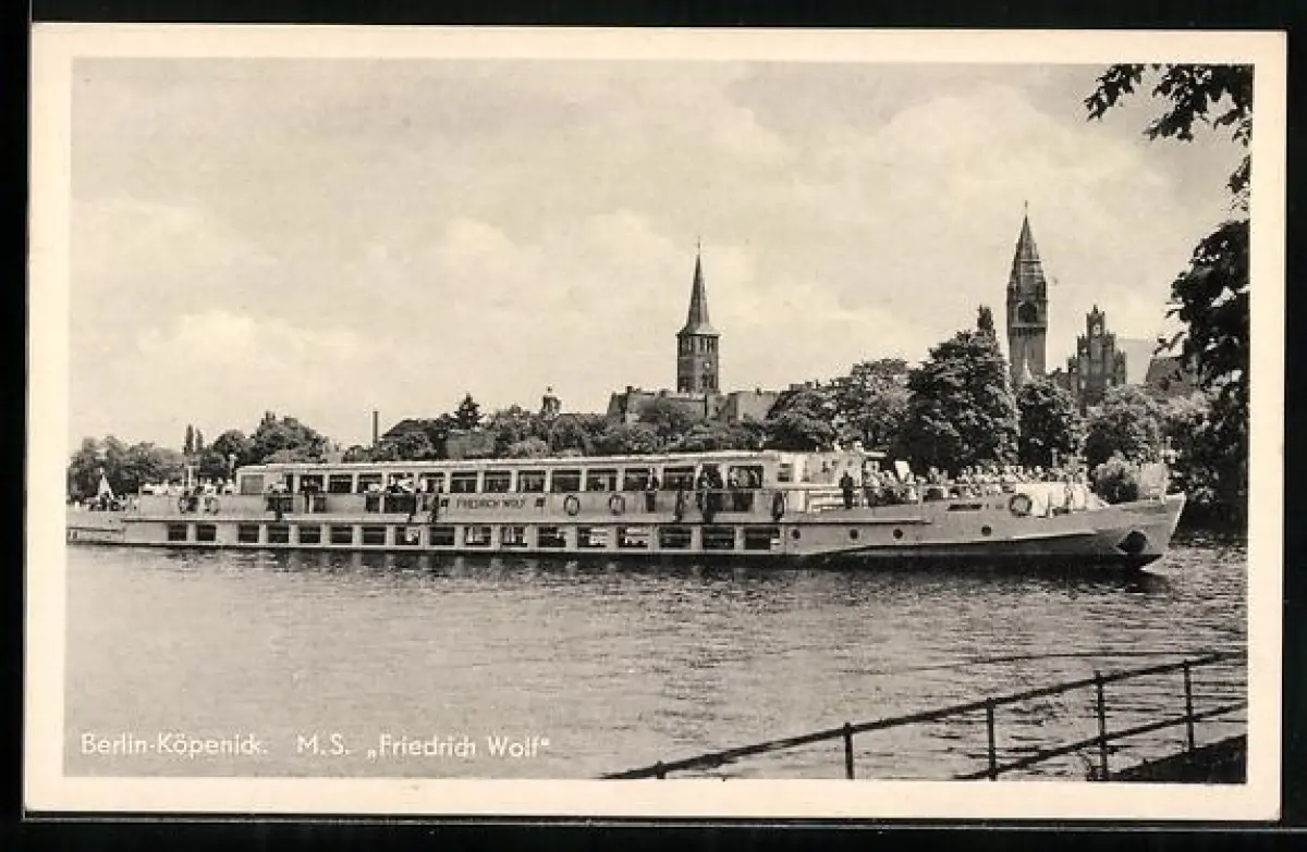 AK Berlin-Köpenick, Motorschiff Friedrich Wolf vor der Kirche und Rathaus von Köpenick