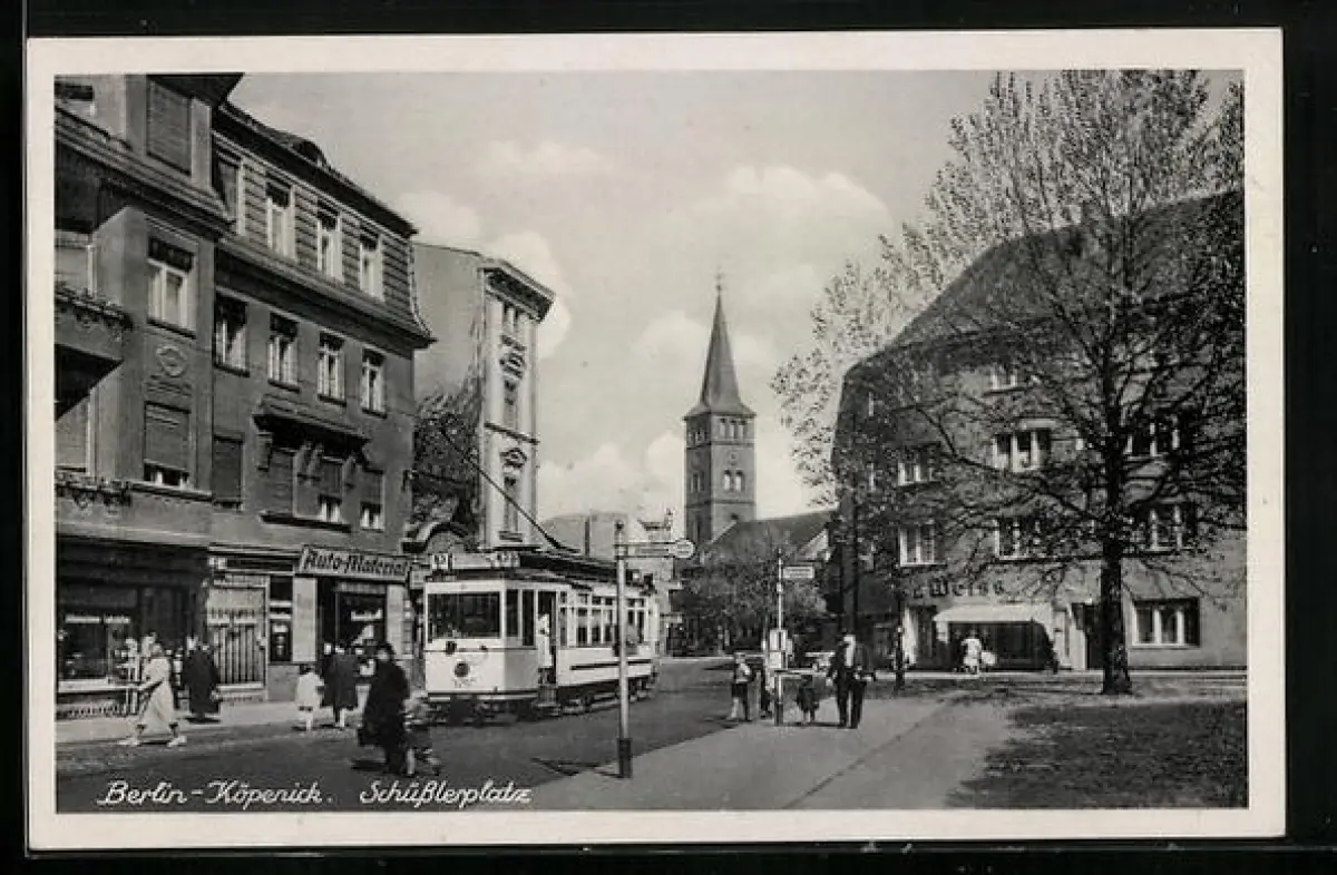 AK Berlin-Köpenick, Schüsslerplatz mit Strassenbahn