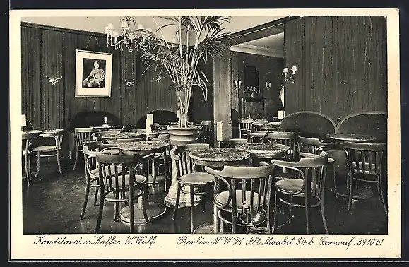 AK Berlin, Konditorei u. Kaffee W. Wulff, Alt-Moabit 84b, Innenansicht Speisesaal