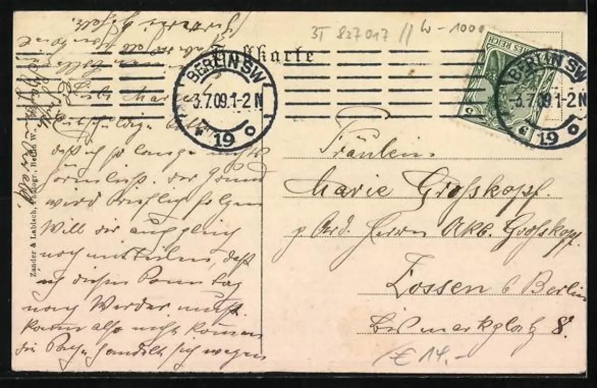 gelaufen 1909, Eckknicke re. oben, guter Zustand