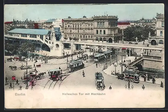 AK Berlin-Kreuzberg, Hallesches Tor mit Hochbahn und Strassenbahnen