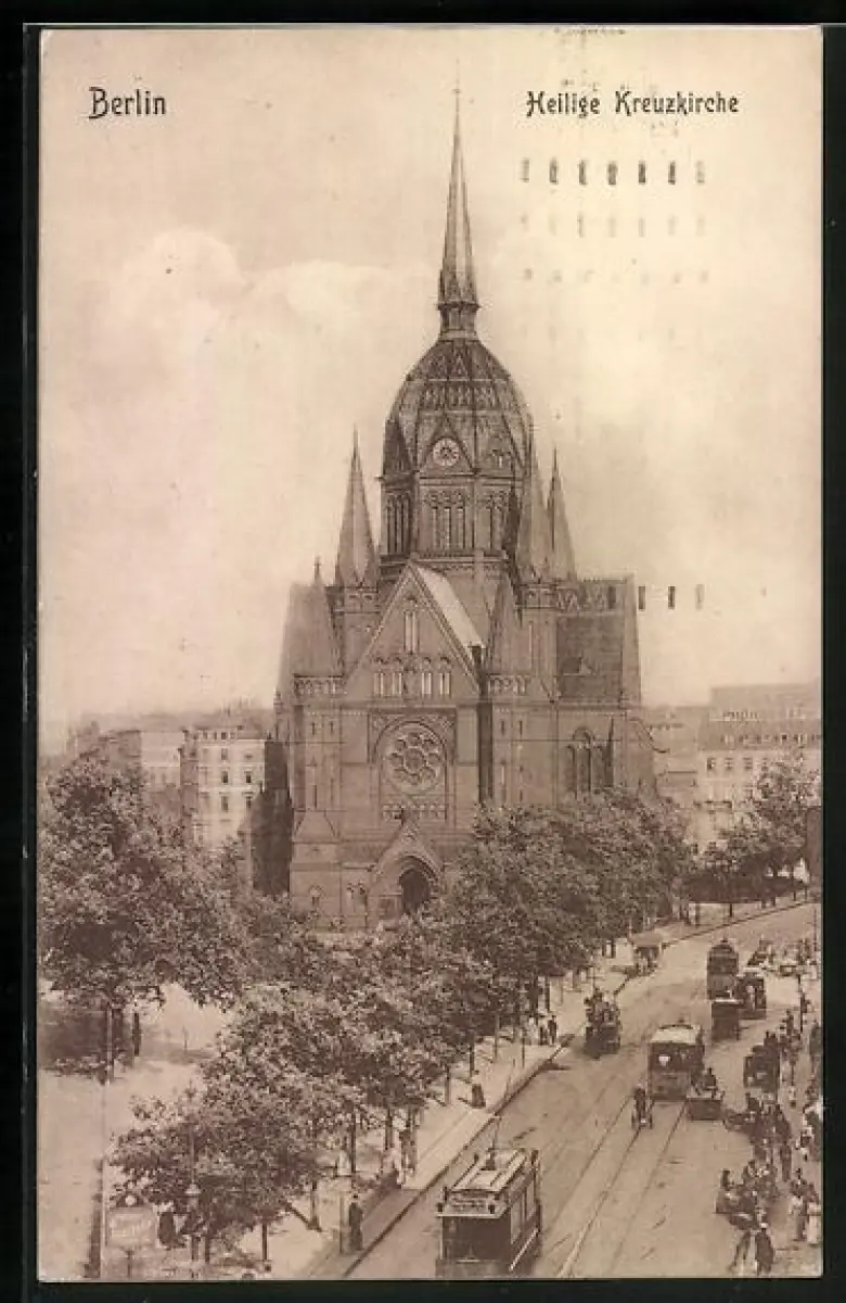 AK Berlin-Kreuzberg, Strassenbahn an der Heilig-Kreuz-Kirche