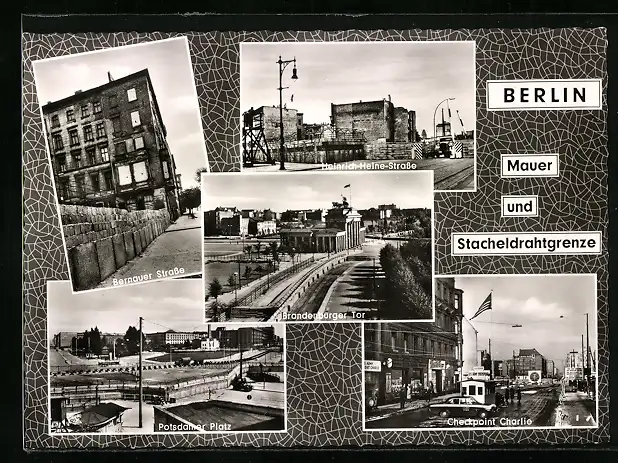 AK Berlin, Mauer und Stacheldrahtgrenze, Bernauer- u. Heinrich-Heine-Str. Checkpoint Charlie, Potsdamer Platz