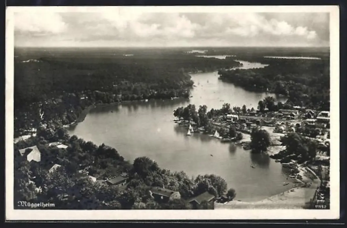 AK Berlin-Müggelheim, Fliegeraufnahme der Flusspartie und angrenzender Gebäude