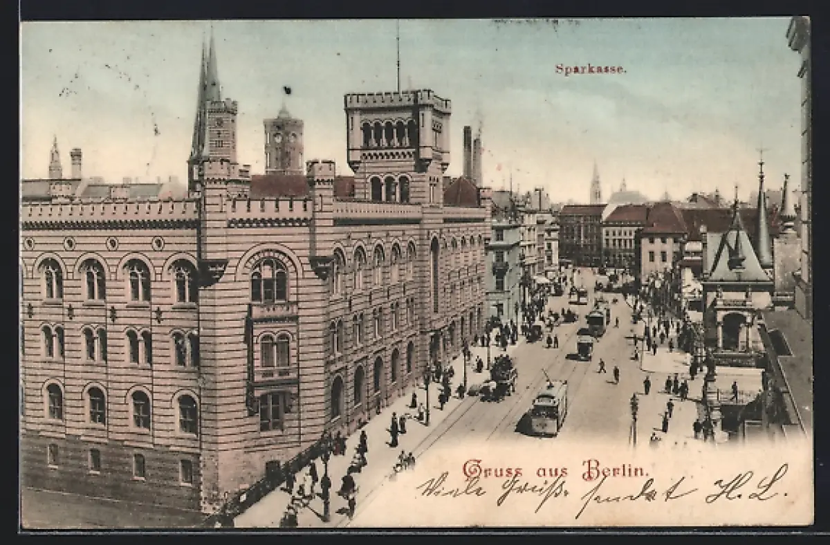 AK Berlin, Mühledamm mit Sparkasse und Strassenbahn