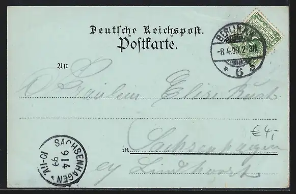alte Ansichtskarte, gelaufen 1899, Eckknick li. unten, minimale Einrisse unten li. u. mttig, Bugspur li. oben, guter Zustand